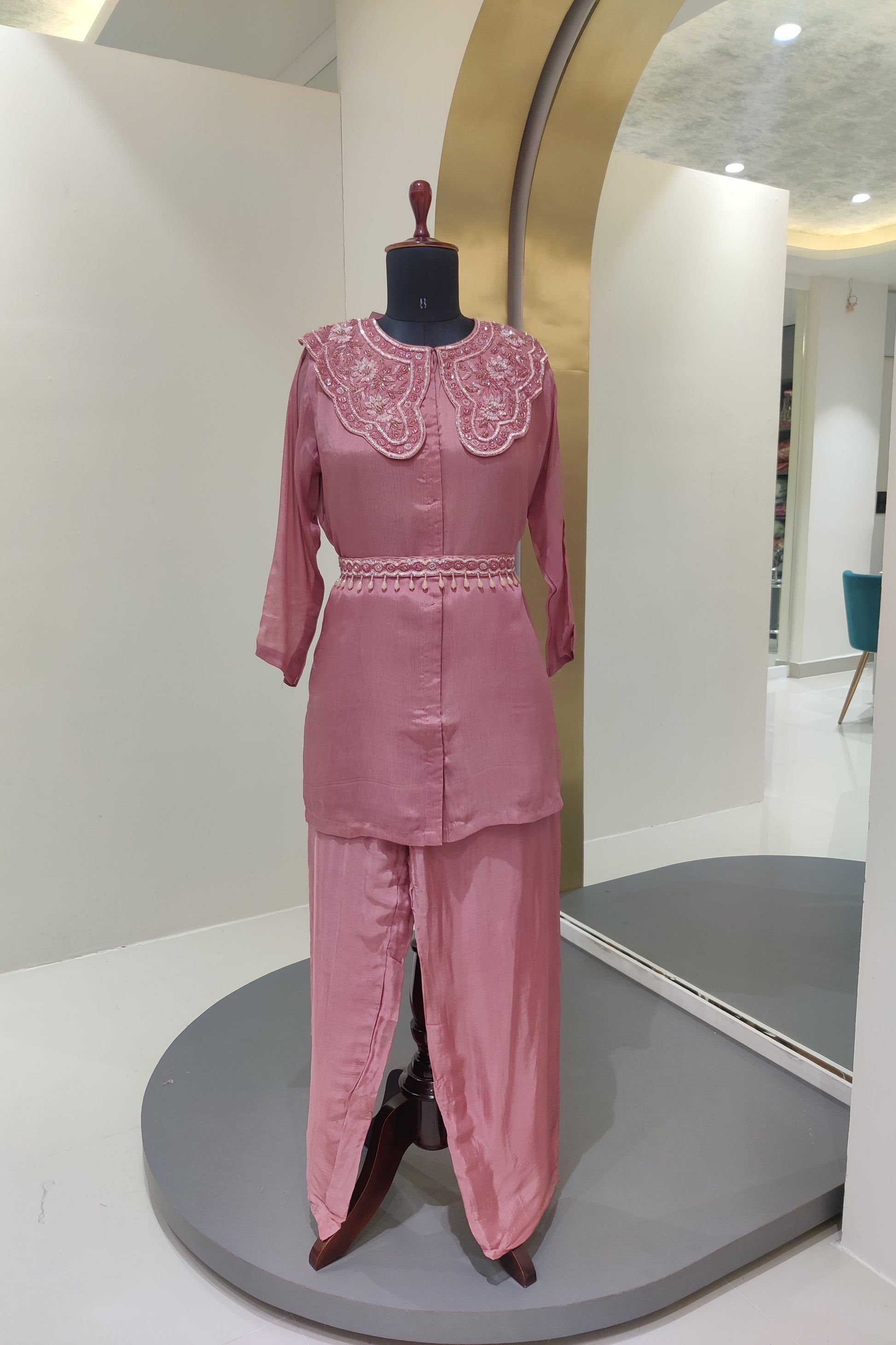Upgrade your wardrobe with our chinnon hand work cordset. Made with luxurious chinnon fabric, this set features stunning hand work and comes with a chic belt and cords. Elevate your style game with this gorgeous and versatile piece.
