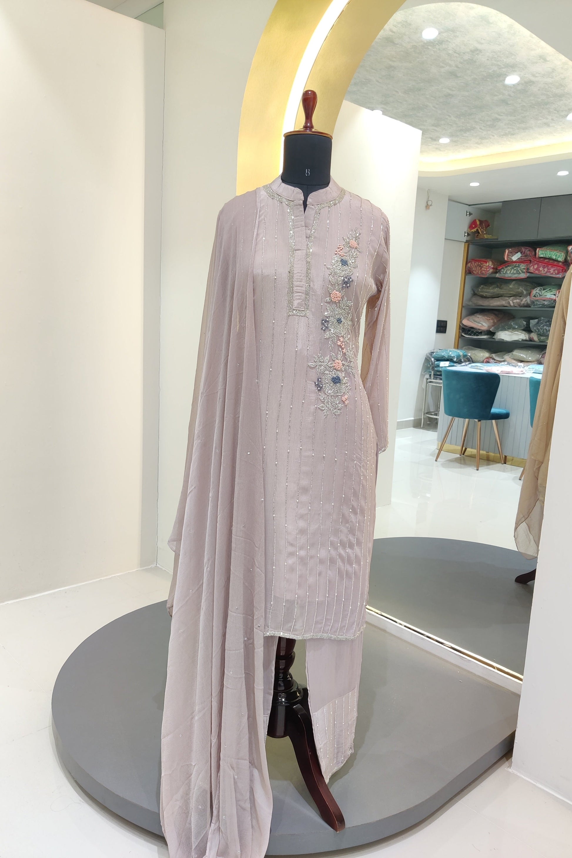 Crafted from chinnon fabric, this hand work suit showcases intricate and heavy hand work for a luxurious touch. Expertly designed and made, it exudes elegance and sophistication. Elevate your style with this beautifully detailed suit.