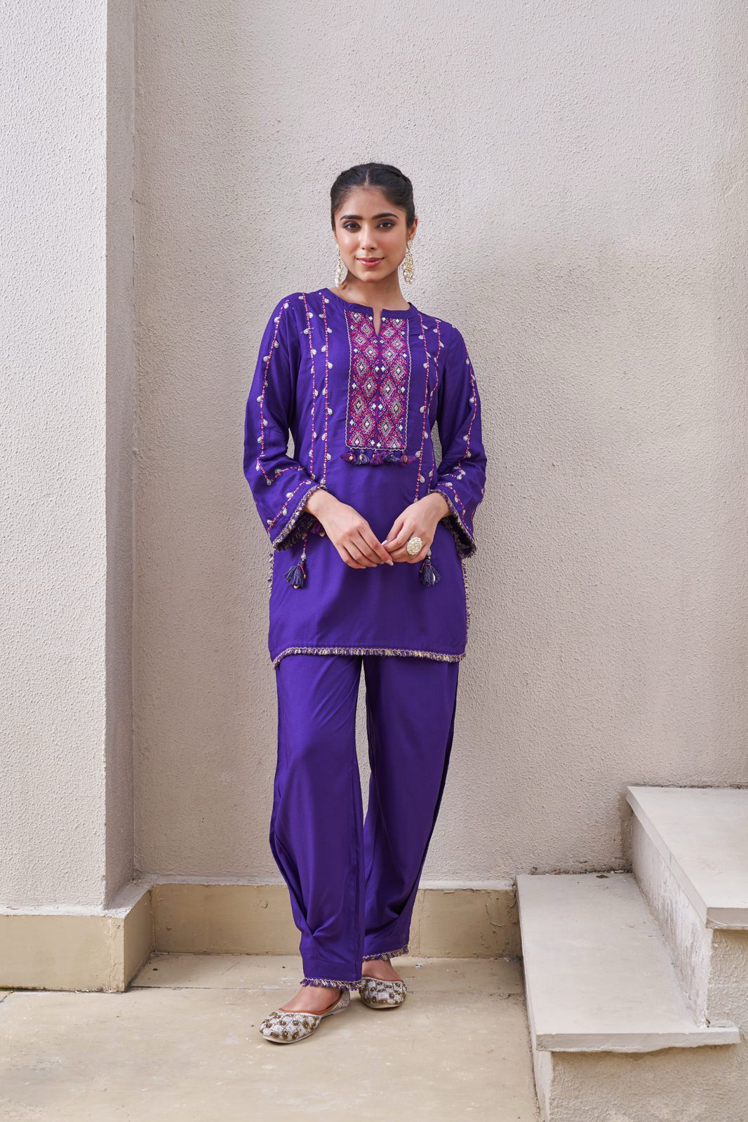 Discover the Farsi style cord set featuring intricate multicolored thread work that brings authentic craftsmanship to your wardrobe. Complemented by matching Farsi style pants, this set blends traditional design with modern comfort. Ideal for those who appreciate detailed handiwork and seek a distinctive, culturally rich outfit with refined elegance.