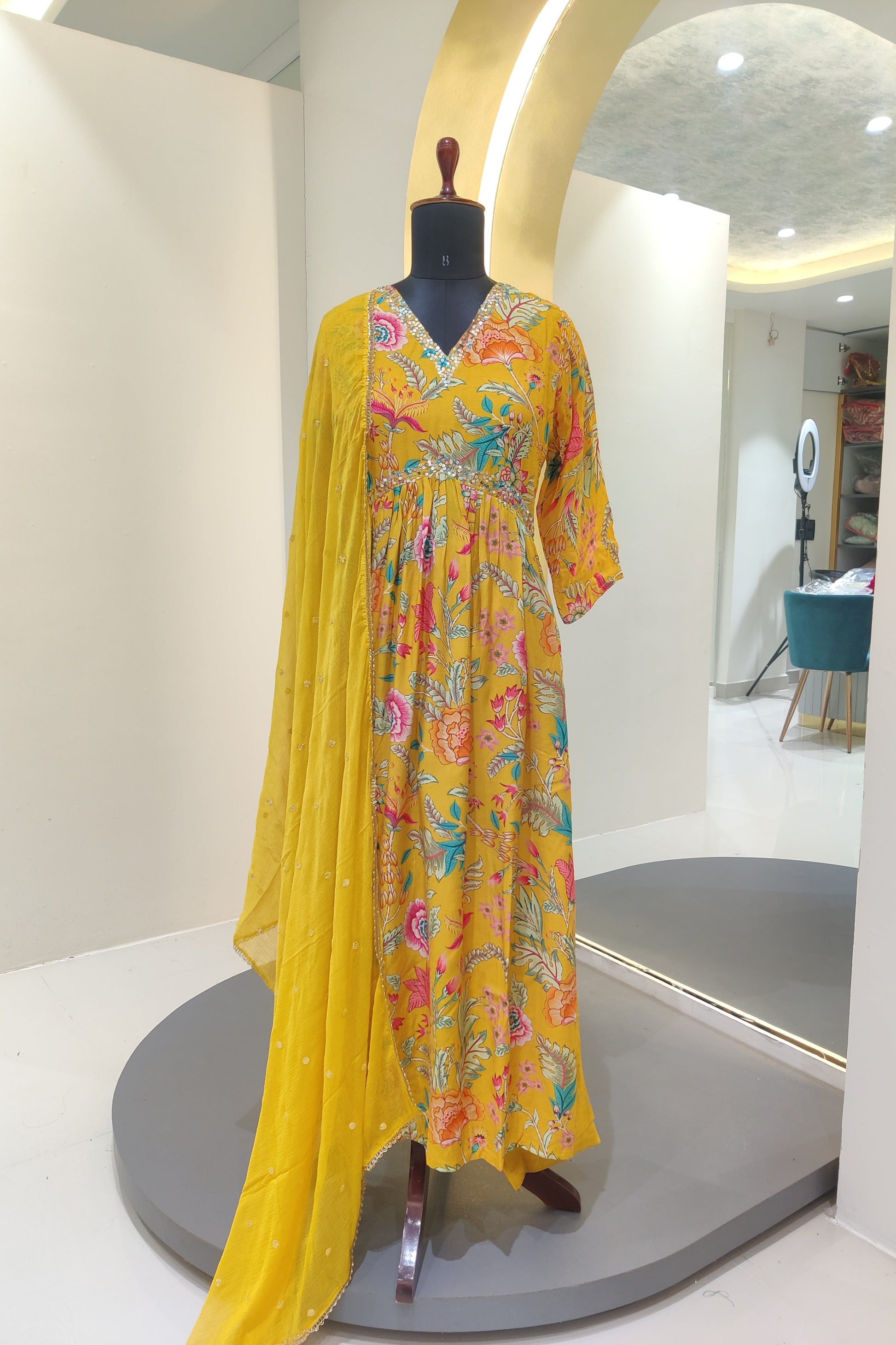 This Muslin Alia style suit is expertly crafted for a comfortable and stylish fit. Made with high-quality muslin fabric, it is inherently breathable and lightweight. The shantoon pants and chiffon dupatta complete the elegant look, making it perfect for any occasion.