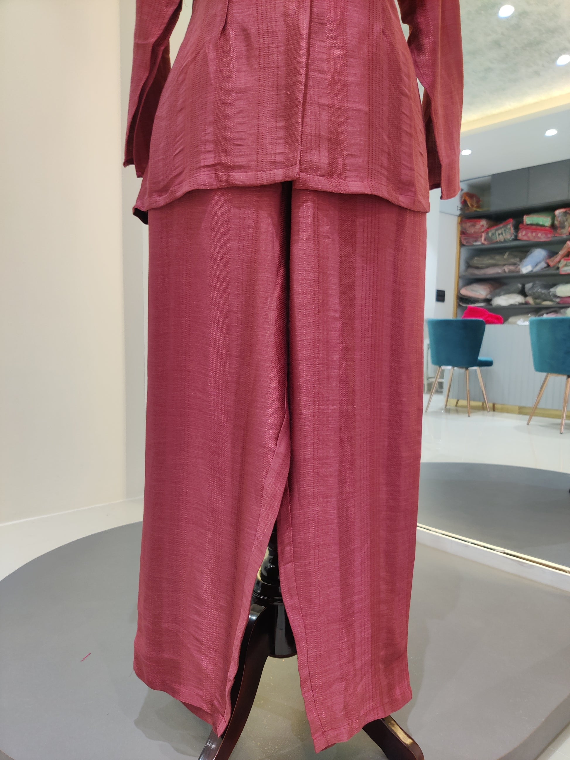 Elevate your style with our premium imported fabric suit style cord set. Each piece is handcrafted with intricate work on the neck, adding a touch of elegance to your wardrobe. Perfect for formal occasions or a commandingly stylish look.