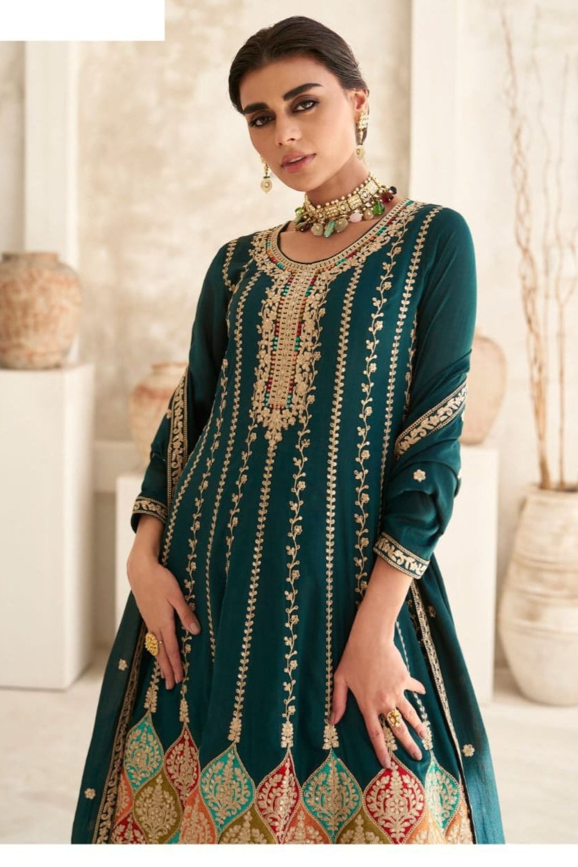 Expertly crafted with intricate Zari work and luxurious silk, this suit exudes elegance and sophistication. Elevate your style with this timeless piece, perfect for any formal occasion. Made with expert precision, this suit will surely impress with its impeccable quality and stunning design.